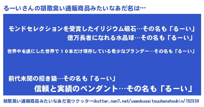 | 男性向けラノベタイトル風あだ名 | 『この素晴らしい世界にるーいを!』 |