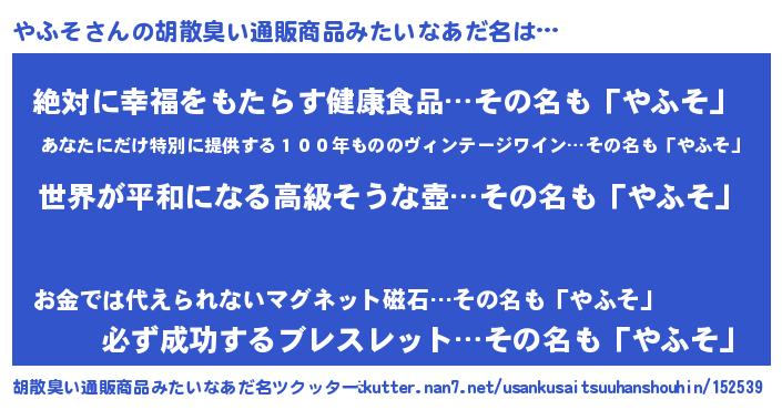 | ヘコむあだ名 | 『豆乳』『やふそ(震え声)』『やふを』 |