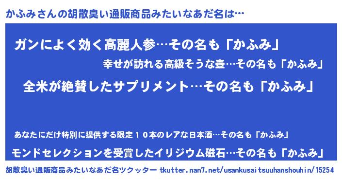 | 男性向けラノベタイトル風あだ名 | 『かふみの嫁は女の子じゃないと思った?』 |