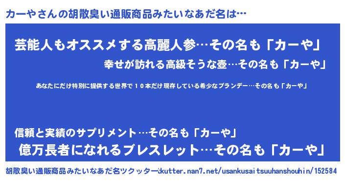 | 男性向けラノベタイトル風あだ名 | 『この素晴らしい世界にカーやを!』 |