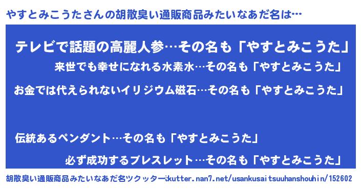 | ヘコむあだ名 | 『やすもー』『やすとみこうた(笑)』 |