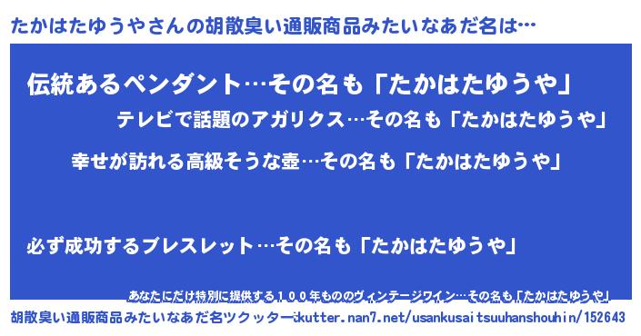 | 男性向けラノベタイトル風あだ名 | 『タカハタユウヤスレイヤー』 |
