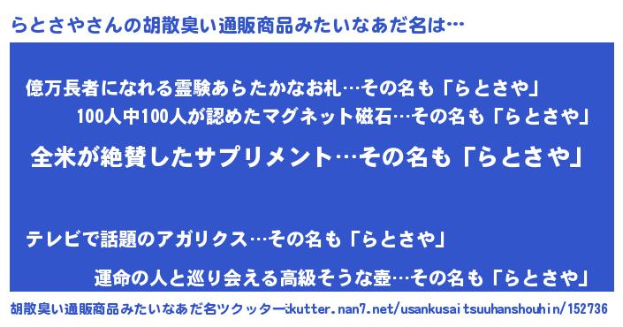 | 意味不明あだ名 | 『とにかく怪しいらとさや』 |