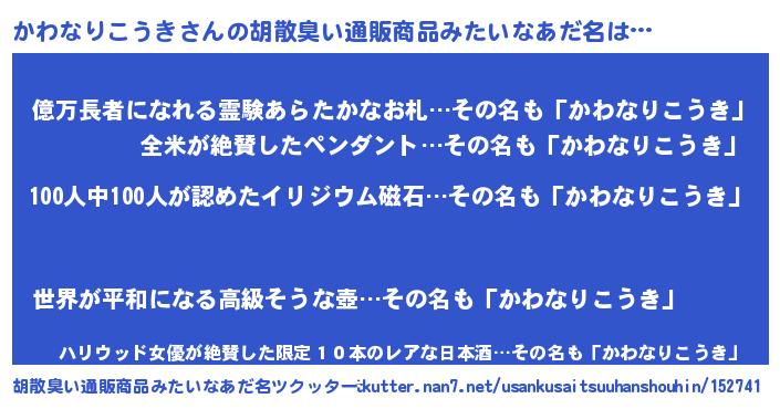 | 男性向けラノベタイトル風あだ名 | 『おまえをオタクにしてやるから、俺をかわなりこうきにしてくれ! 』 |