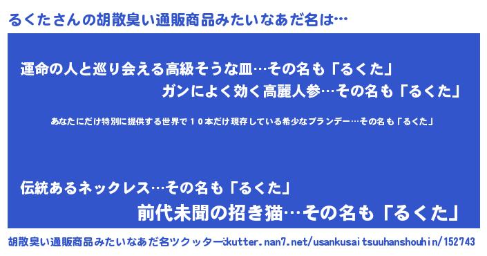 | 男性向けラノベタイトル風あだ名 | 『るくた~年齢イコール彼女いない歴の魔法使い~』 |