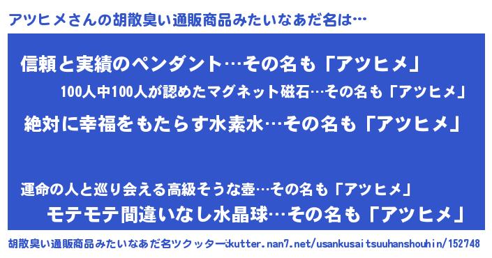 | 意味不明あだ名 | 『永久保存アツヒメ』『ペロリンアツヒメ』 |