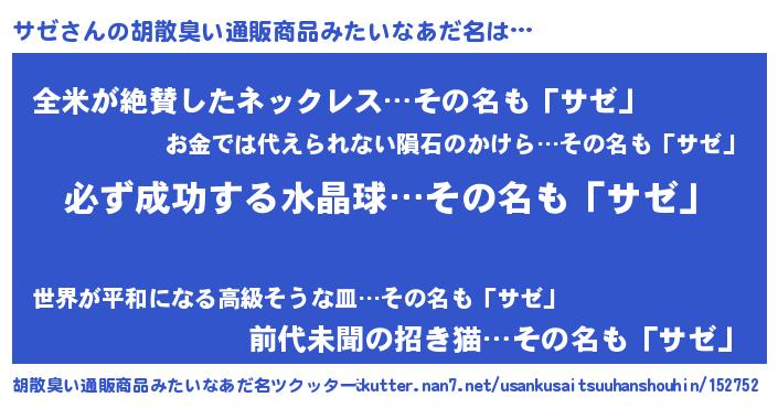 | 男性向けラノベタイトル風あだ名 | 『サゼの憂鬱』『転生したらサゼだった件』 |