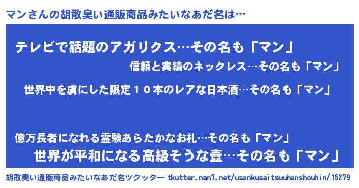 | 意味不明あだ名 | 『住所不定無職マン(39歳)』『自称マン』 |