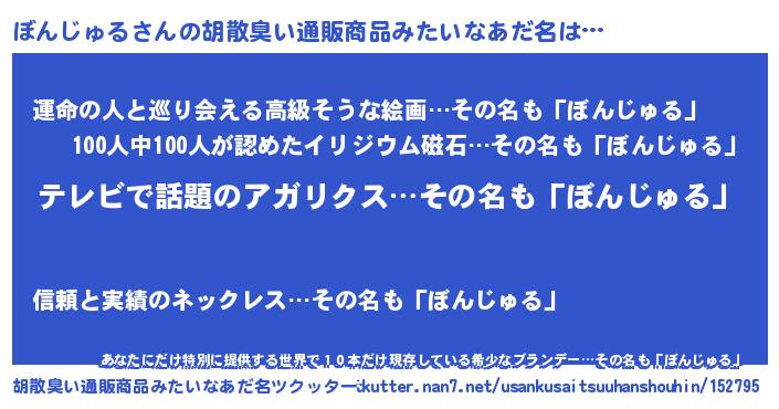 | 男性向けラノベタイトル風あだ名 | 『転生したらぼんじゅるだった件』 |