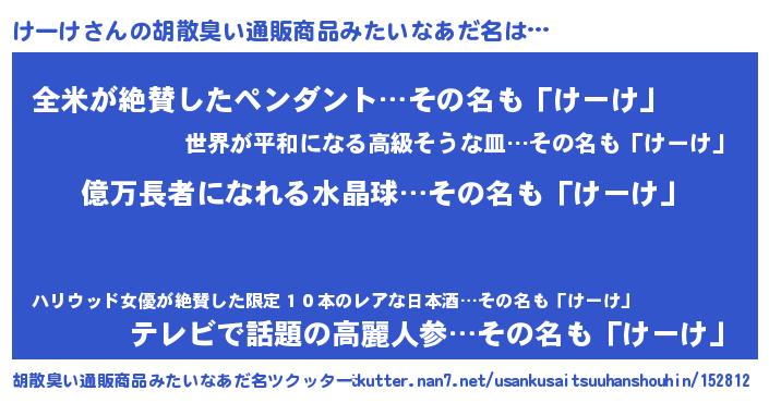 | 男性向けラノベタイトル風あだ名 | 『けーけに滅ぼされるだけの簡単なお仕事です』 |