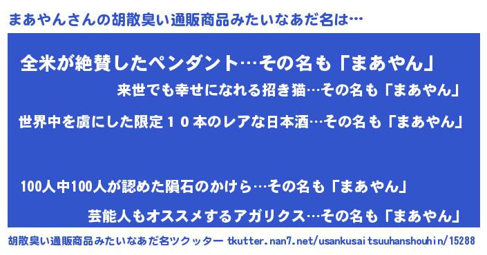 | 男性向けラノベタイトル風あだ名 | 『魔弾の王とまあやん』 |