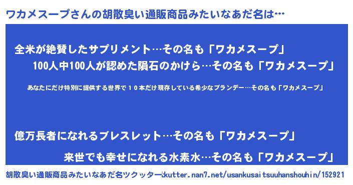 | 意味不明あだ名 | 『住所不定無職ワカメスープ(93歳)』 |