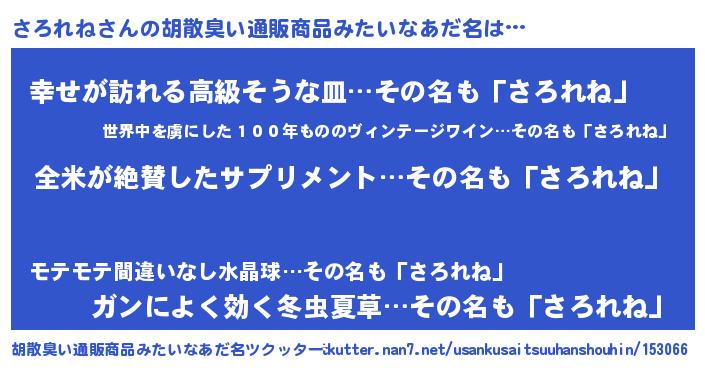 | 女子向けラノベタイトル風あだ名 | 『さろれねの玉の輿計画!』 |