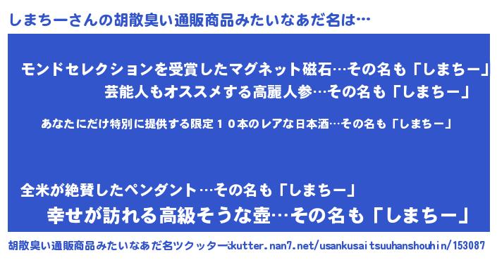 | 男性向けラノベタイトル風あだ名 | 『この素晴らしい世界にしまちーを!』 |