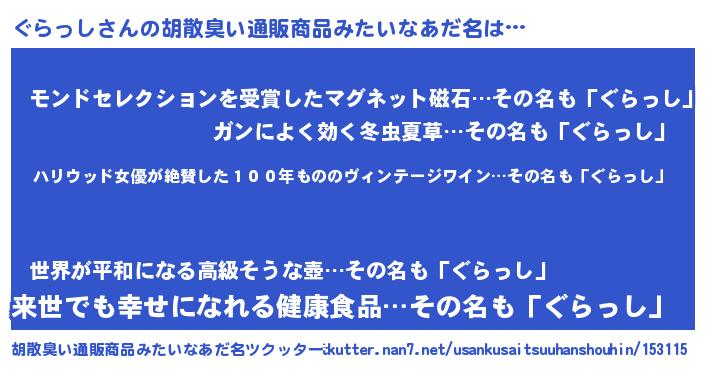 | ヘコむあだ名 | 『ぐらっし(小並感)』『酢こんぶ』 |