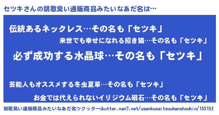 | 男性向けラノベタイトル風あだ名 | 『セツキの憂鬱』『セツキスレイヤー』 |