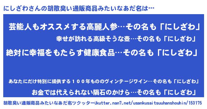 | 女子向けラノベタイトル風あだ名 | 『異世界で失敗しない100のにしざわ』 |