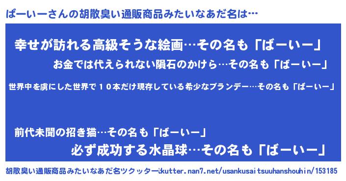 | 男性向けラノベタイトル風あだ名 | 『魔弾の王とばーいー』『ばーいーの憂鬱』 |