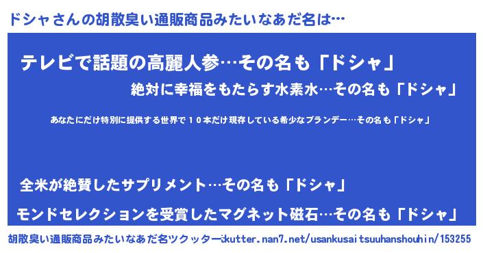 | 男性向けラノベタイトル風あだ名 | 『この素晴らしい世界にドシャを!』 |