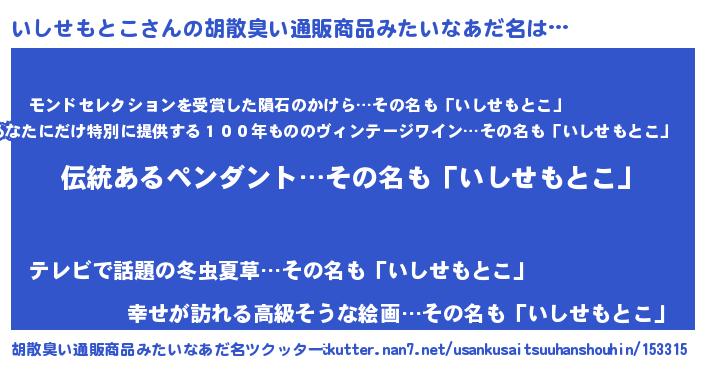 | 意味不明あだ名 | 『とにかく怪しいいしせもとこ』 |