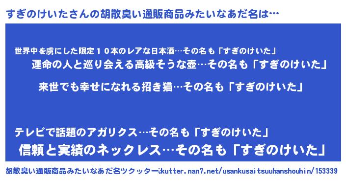 | ヘコむあだ名 | 『すぎのけいた(小並感)』『すぎっ子』 |
