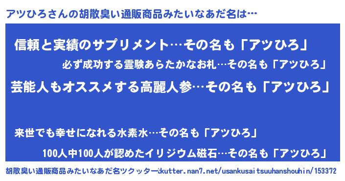 | 男性向けラノベタイトル風あだ名 | 『Re:アツひろから始める異世界生活』 |