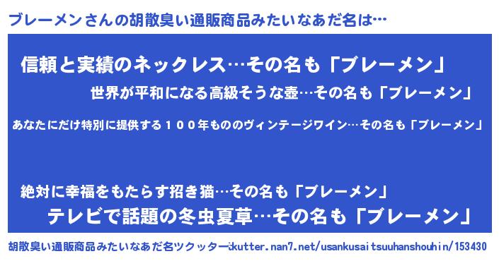 | 意味不明あだ名 | 『住所不定無職ブレーメン(8歳)』 |