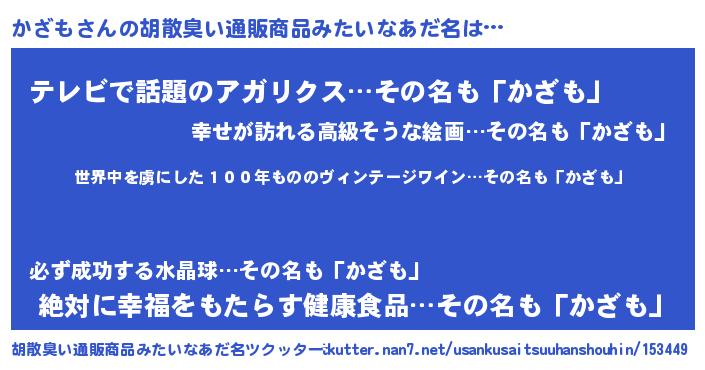 | 意味不明あだ名 | 『住所不定無職かざも(2歳)』『自称かざも』 |