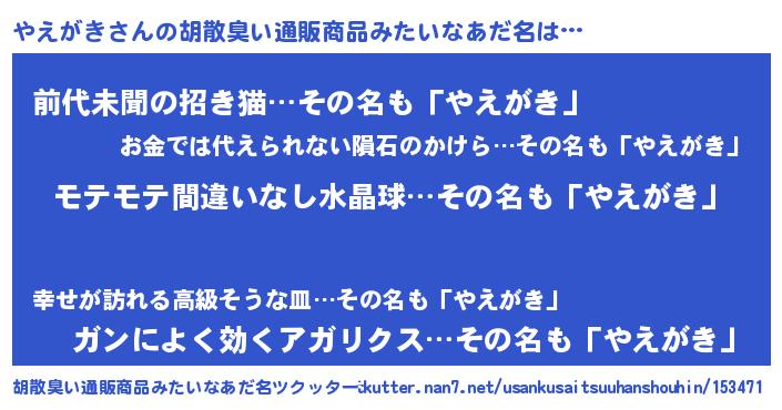 | ヒーロー風カッコイイあだ名 | 『スーパーヤエガキ』『ネオヤエガキ』 |