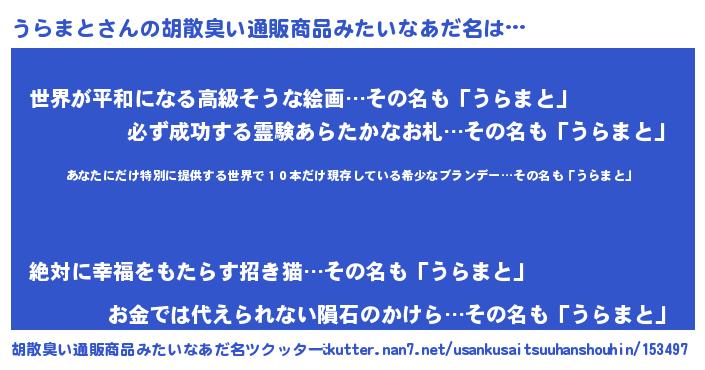 | 男性向けラノベタイトル風あだ名 | 『この素晴らしい世界にうらまとを!』 |