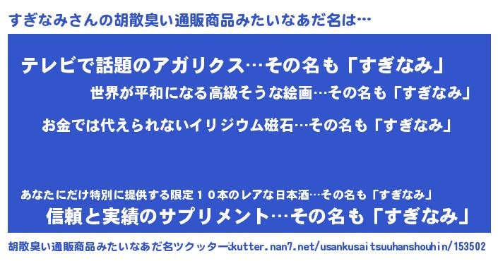 | 女子向けラノベタイトル風あだ名 | 『すぎなみ恋絵巻』『すぎなみ伯爵の花嫁』 |