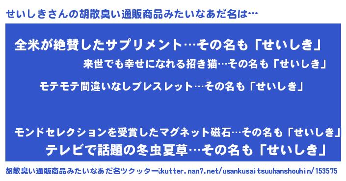 | ヒーロー風カッコイイあだ名 | 『スーパーセイシキ』『黄金騎士セイ』 |