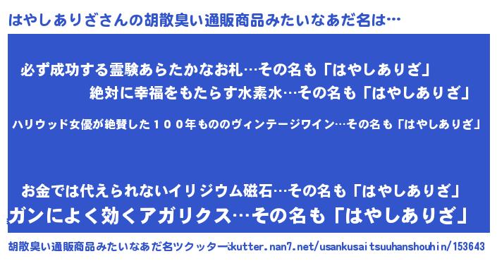 | 意味不明あだ名 | 『住所不定無職はやしありざ(7歳)』 |