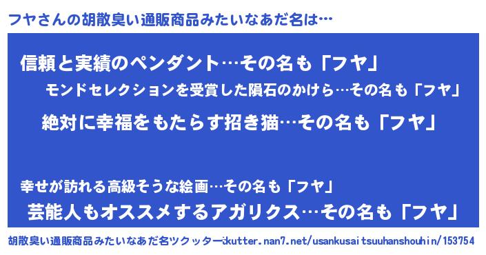 | ヘコむあだ名 | 『フヤ(小並感)』『フヤぷりん』 |