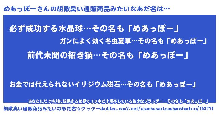 | 意味不明あだ名 | 『永久保存めあっぽー』『自称めあっぽー』 |