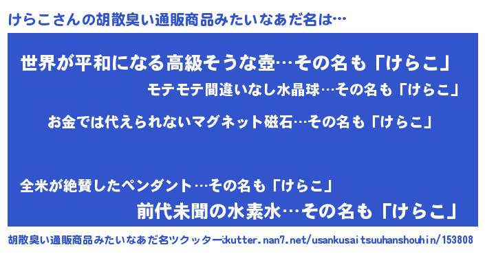 | ヒーロー風カッコイイあだ名 | 『慈愛の使者けらこ』『ネオケラコ』 |