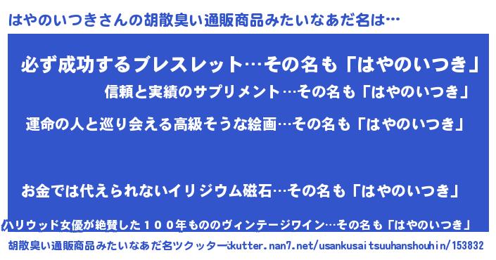 | 男性向けラノベタイトル風あだ名 | 『はやのいつきに滅ぼされるだけの簡単なお仕事です』 |