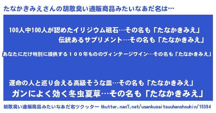 | 男性向けラノベタイトル風あだ名 | 『たなかきみえ~年齢イコール彼女いない歴の魔法使い~』 |