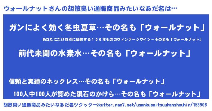 | 男性向けラノベタイトル風あだ名 | 『うちのウォールナットが世界を掌握している!』 |