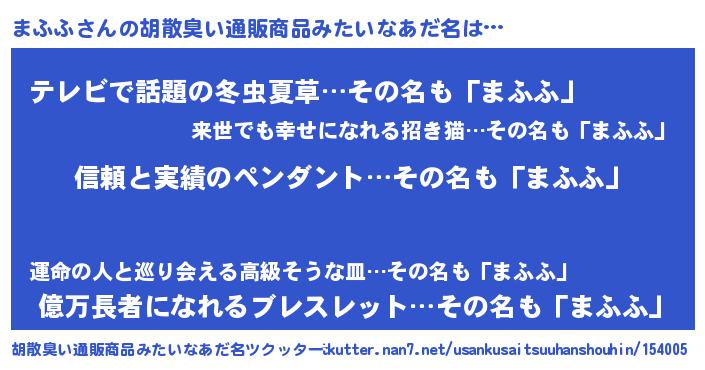 | 意味不明あだ名 | 『めかぶ科まふふ属』『自称まふふ』 |