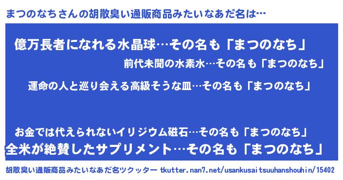 | 女子向けラノベタイトル風あだ名 | 『まつのなちの玉の輿計画!』 |