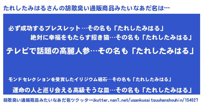 | 男性向けラノベタイトル風あだ名 | 『たれしたみはるに滅ぼされるだけの簡単なお仕事です』 |
