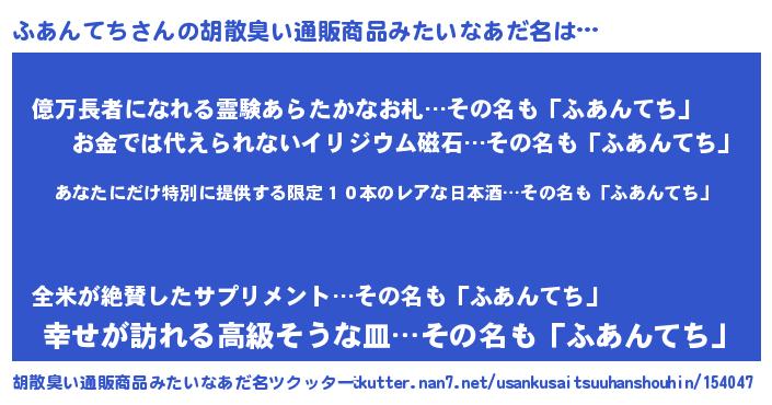 | 男性向けラノベタイトル風あだ名 | 『この素晴らしい世界にふあんてちを!』 |