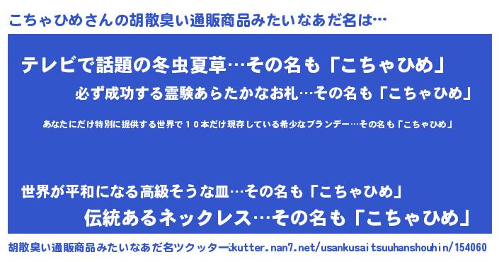 | 男性向けラノベタイトル風あだ名 | 『こちゃひめ~年齢イコール彼女いない歴の魔法使い~』 |
