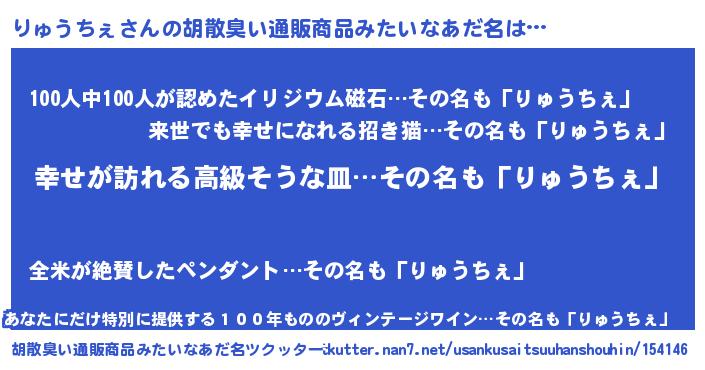 | 男性向けラノベタイトル風あだ名 | 『やはりりゅうちぇの青春ラブコメはまちがっている 』 |