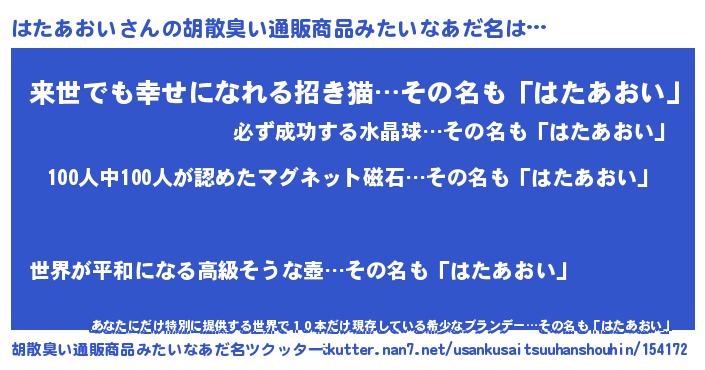 | 男性向けラノベタイトル風あだ名 | 『おまえをオタクにしてやるから、俺をはたあおいにしてくれ! 』 |