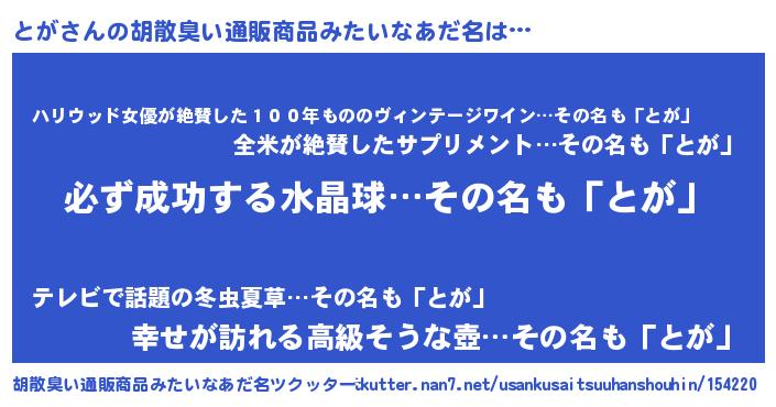| 男性向けラノベタイトル風あだ名 | 『とがの憂鬱』『魔弾の王ととが』 |