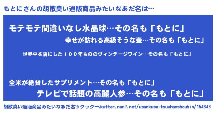 | 意味不明あだ名 | 『住所不定無職もとに(13歳)』『自称もとに』 |