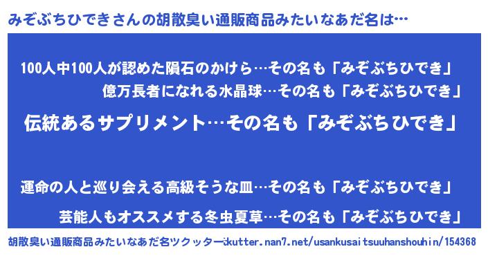 | 男性向けラノベタイトル風あだ名 | 『ダンジョンにみぞぶちひできを求めるのは間違っているだろうか』 |