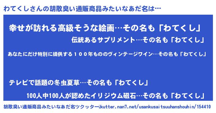 | 意味不明あだ名 | 『住所不定無職わてくし(1歳)』 |